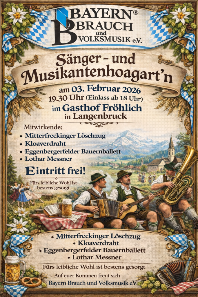 Da Verein Bayern, Brauch und Volksmusik e. V. setzt si mit Herzbluat dafür ein, dass d’ bayerische Volksmusik, d’ alten Liada und unsa guads, überlieferts Brauchtum net in Vergessenheit geraten. Was unsere Hoamat seit Generationen ausmacht – Musi, Gsang, Gmiatlichkeit und z’sammhoitn – des woll’n ma pflegen und weitertragn.